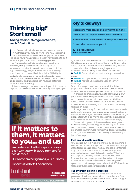 As Australasiaโs self-storage industry continues to evolve, many operators are rethinking what expansion looks like. It doesnโt always mean building big โ increasing square footage or building taller buildings โ especially if youโre not sure how large demand is, planning approvals are shifting demands, starting small can be the smartest way to test a market, add capacity and unlock hidden revenue potential without overcommitting.